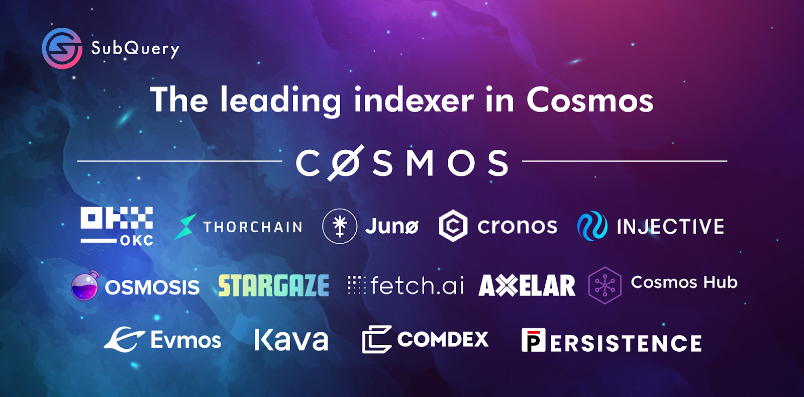 SubQuery is the leading Indexer in Cosmos with integrations in 14 zones including Juno, Cronos, Osmosis, Fetch.ai, Injective, and others. Our indexer provides a fast, reliable, and efficient way for developers to query and analyze data on Cosmos. With our plan to extend our indexing support to all Cosmos chains, we'll be able to offer our services to an even broader range of users and applications, enabling them to access and understand complex blockchain data with ease.