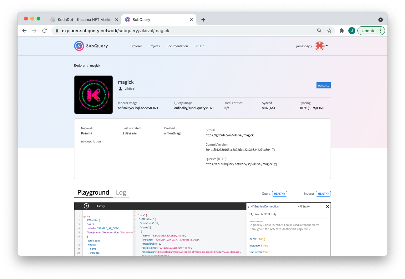 Kodadot is using SubQuery Projects to manage their own project and make updates as required. The indexing and query services we provide are completely managed by SubQuery and provided to the Polkadot community for free in SubQuery’s Explorer.