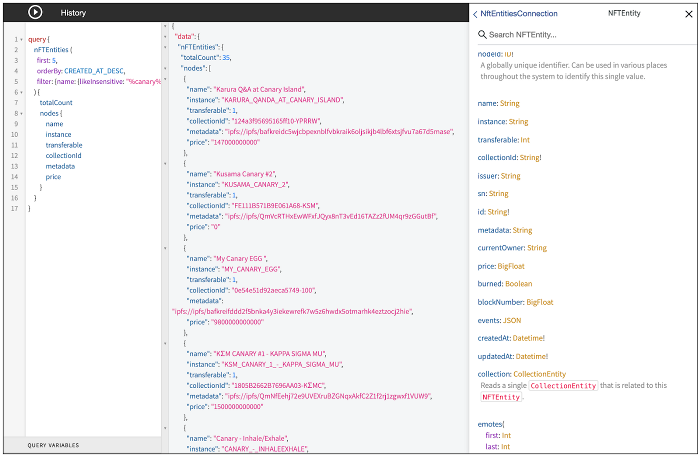 In the example below, we’re using SubQuery to find the first 5 NFT results that match the search term “Canary” on Kusama.