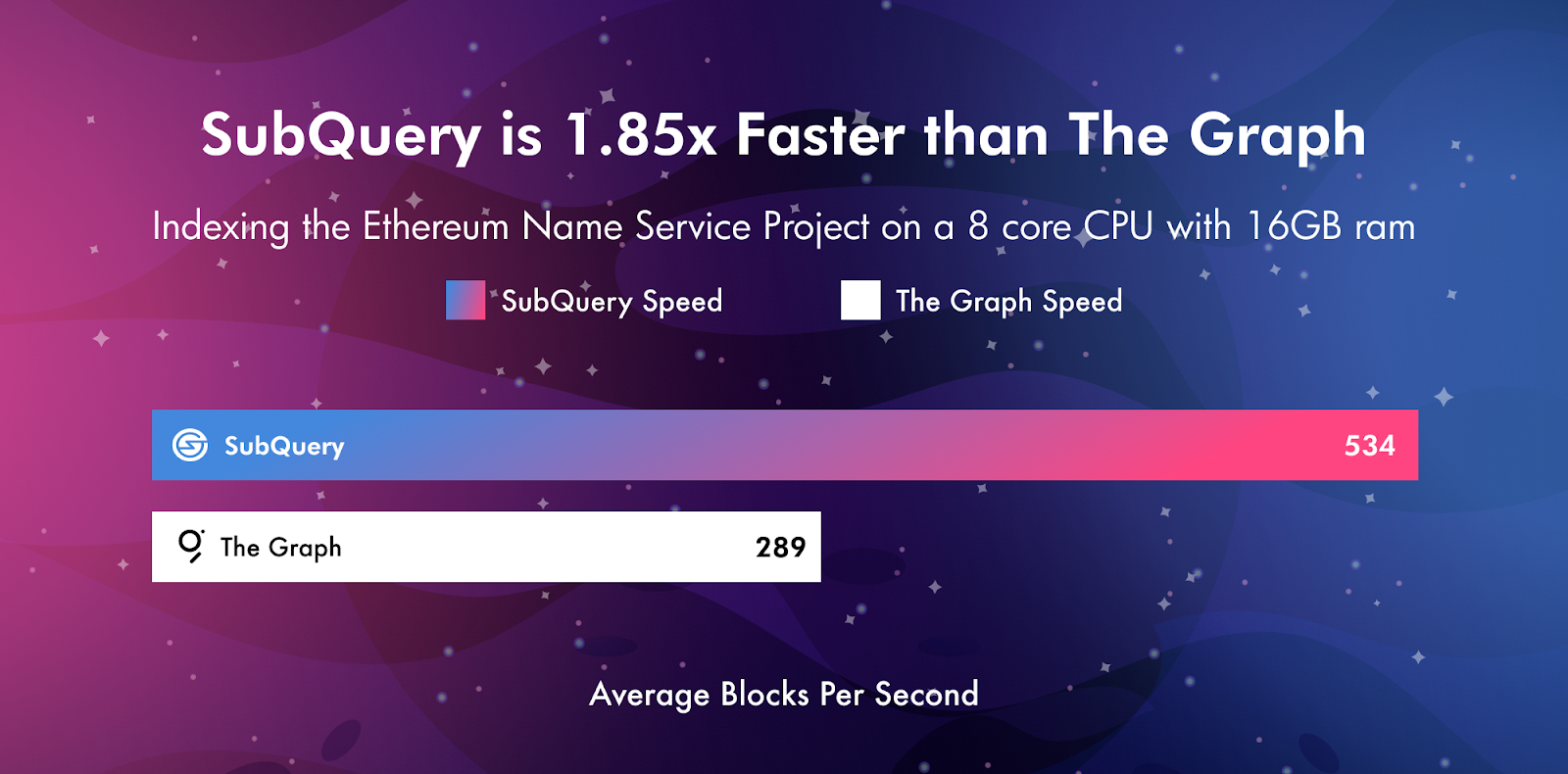 Both SubQuery and The Graph are designed to index data fast, but analysis shows that the existing beta support from SubQuery is already 1.85x faster for common projects over The Graph (e.g the standard Ethereum Name Service project). This adds up when you’re indexing millions of blocks, and is something to consider when choosing your indexer. SubQuery achieves this by using mulit-threading and optimisation of the store to reduce costly database writes. With faster sync times, developers can iterate faster and deliver features to market quicker.