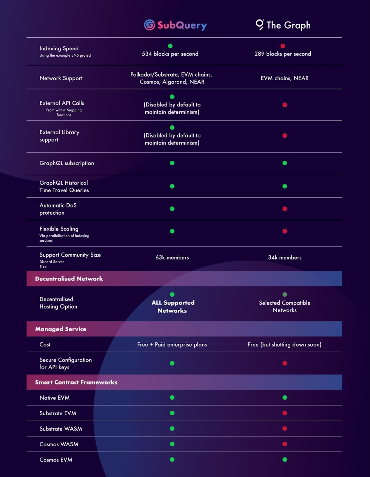 If you would like to find out more about how SubQuery compares to other popular indexers, read our Indexer Comparison article.