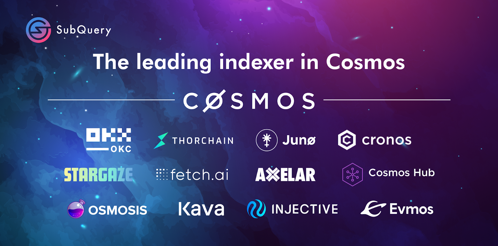 SubQuery is the leading Indexer in Cosmos with integrations in 12 zones including Juno, Cronos, Osmosis, Fetch.ai, Injective, and others. Our indexer provides a fast, reliable, and efficient way for developers to query and analyze data on Cosmos. With our plan to extend our indexing support to all Cosmos chains, we'll be able to offer our services to an even broader range of users and applications, enabling them to access and understand complex blockchain data with ease.