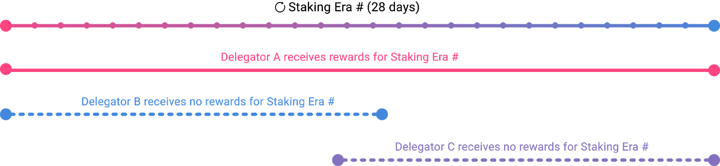 Similarly, delegators can remove their delegation amounts at any point, but they will only receive rewards when they have delegated for the entire staking era.